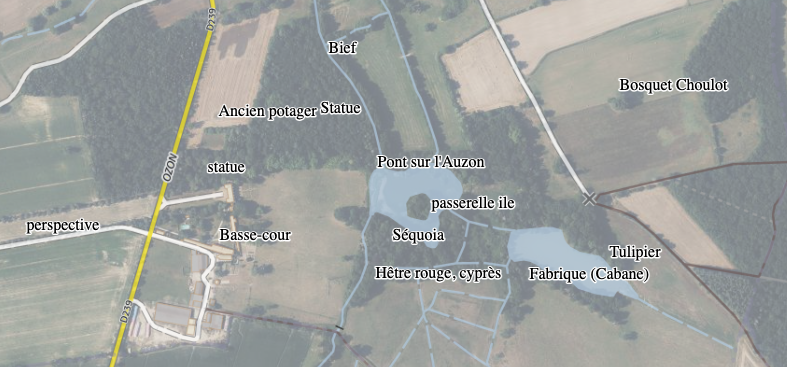 Devant vous le parc avec une allée principale qui part à gauche. Celle de gauche n’est plus mais doit être refaite pour rejoindre à travers le pré le grand hêtre rouge à votre droite (et à droite de l’étang que vous voyez devant vous)