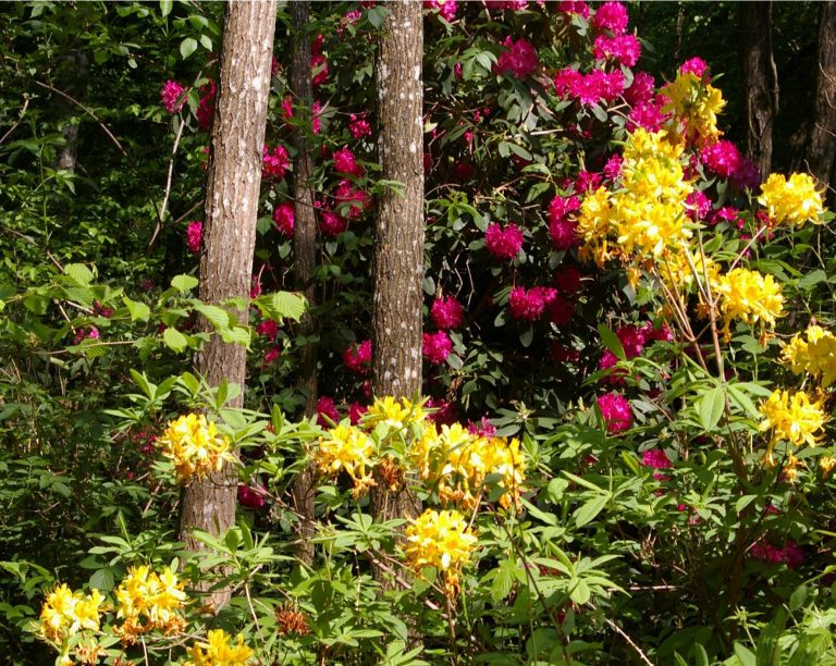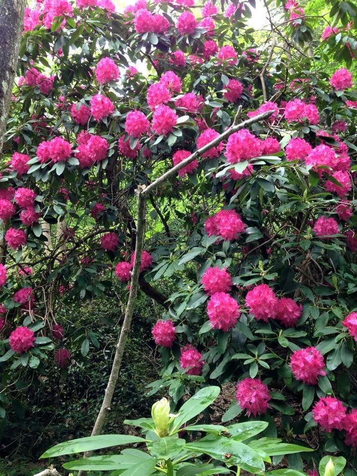 Noisetier de bysance, hêtre rouge, rododendrons,