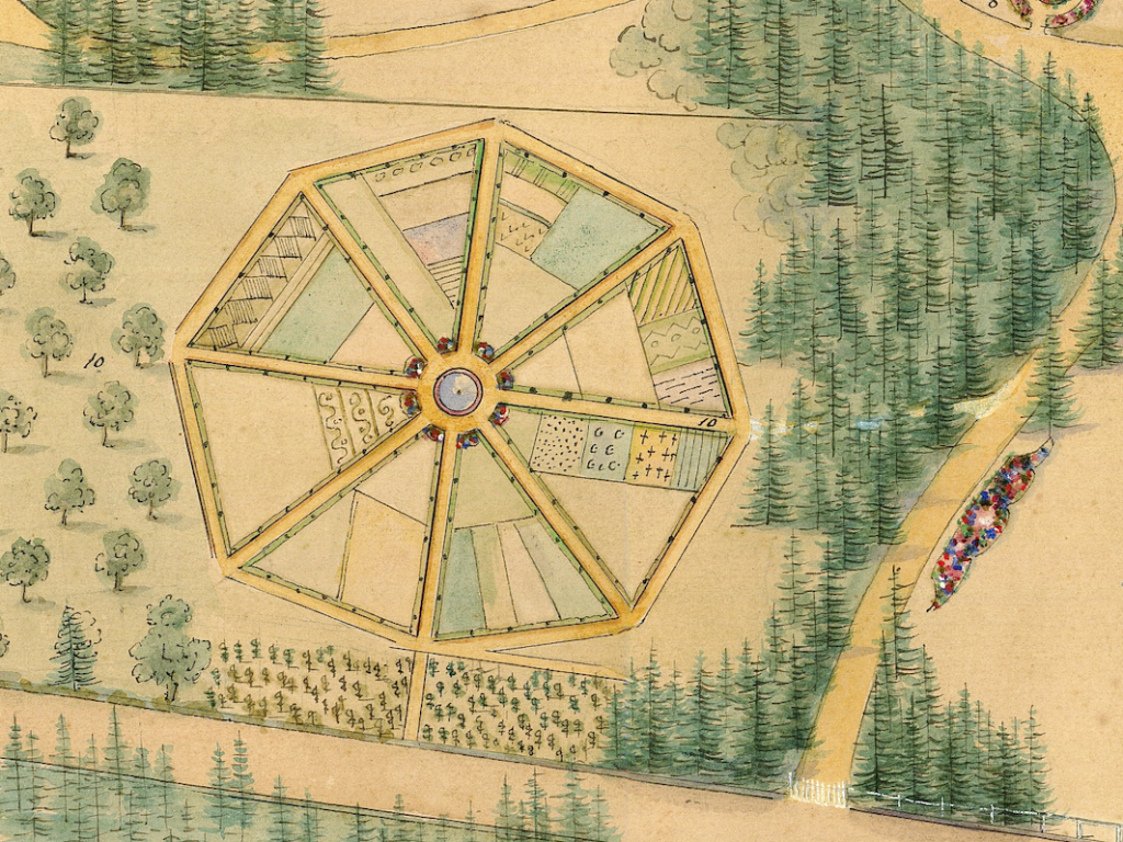 Le potager, s’il n’a pas été réalisé sur un plan hexagonal mais plusieurs carrés avait une superficie de 7600m2